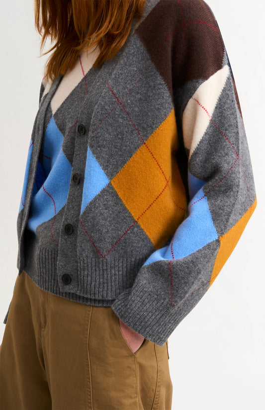 Women's Chunky Argyle Cashmere Cardigan in Grey and Charcoal