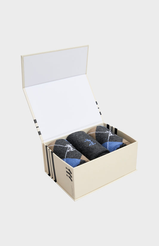 Men’s Argyle Cotton Jacquard Socks in Charcoal, Blue & Camel