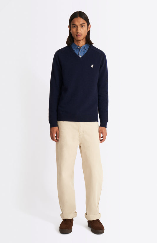 V Neck Lambswool Jumper In Dark Indigo With Contrast Tipping
