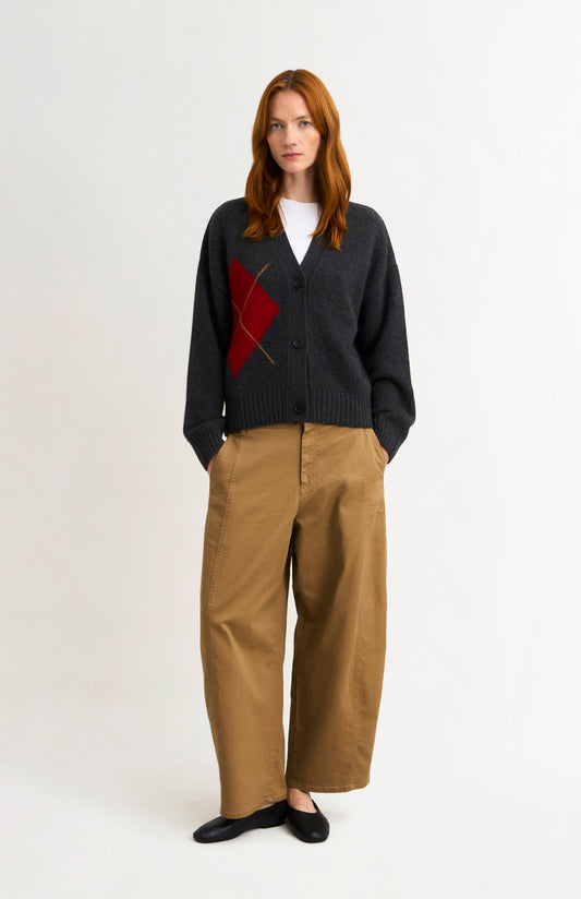 Women's Chunky Argyle Cashmere Cardigan in Charcoal And Red