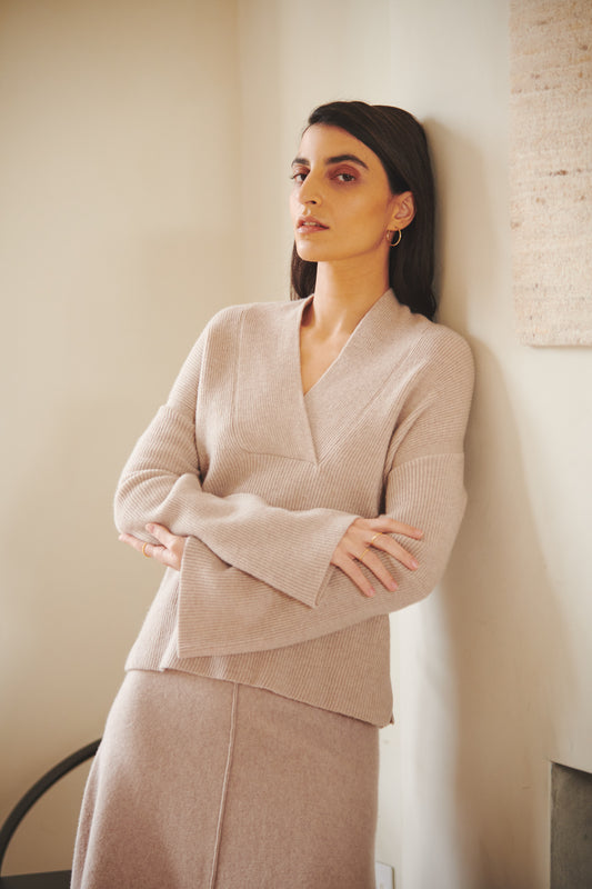 Wool Cashmere Blend Wide Neck Rib Jumper In Sand