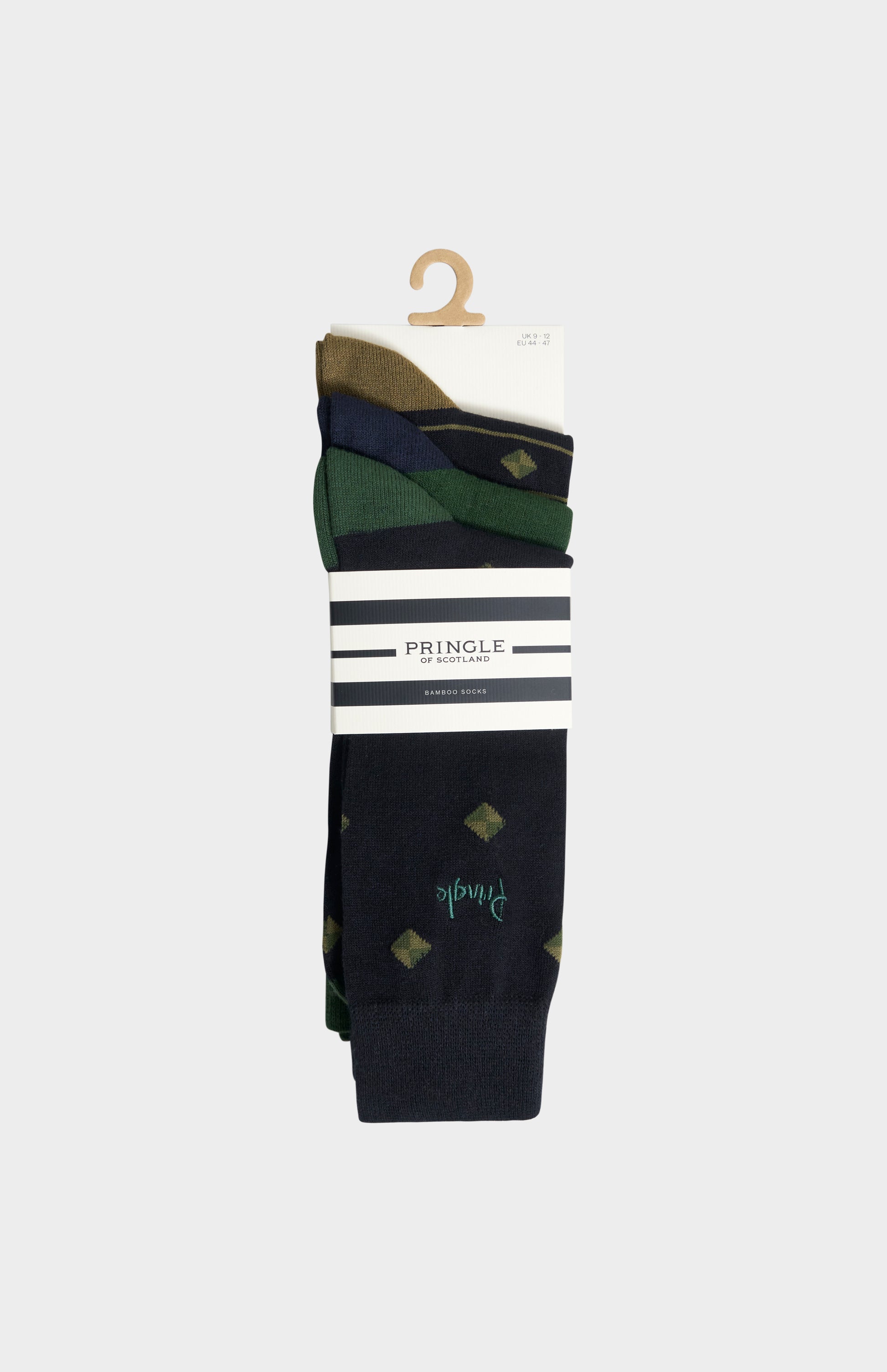 Elevate your everyday essentials with this 3 - pack of men’s multi green bamboo dress socks, featuring an elegant square diamond jacquard pattern and refined Pringle embroidery. Expertly crafted for a soft, breathable feel, these socks offer natural moisture - wicking comfort and a polished finish, perfect for business or formal wear.