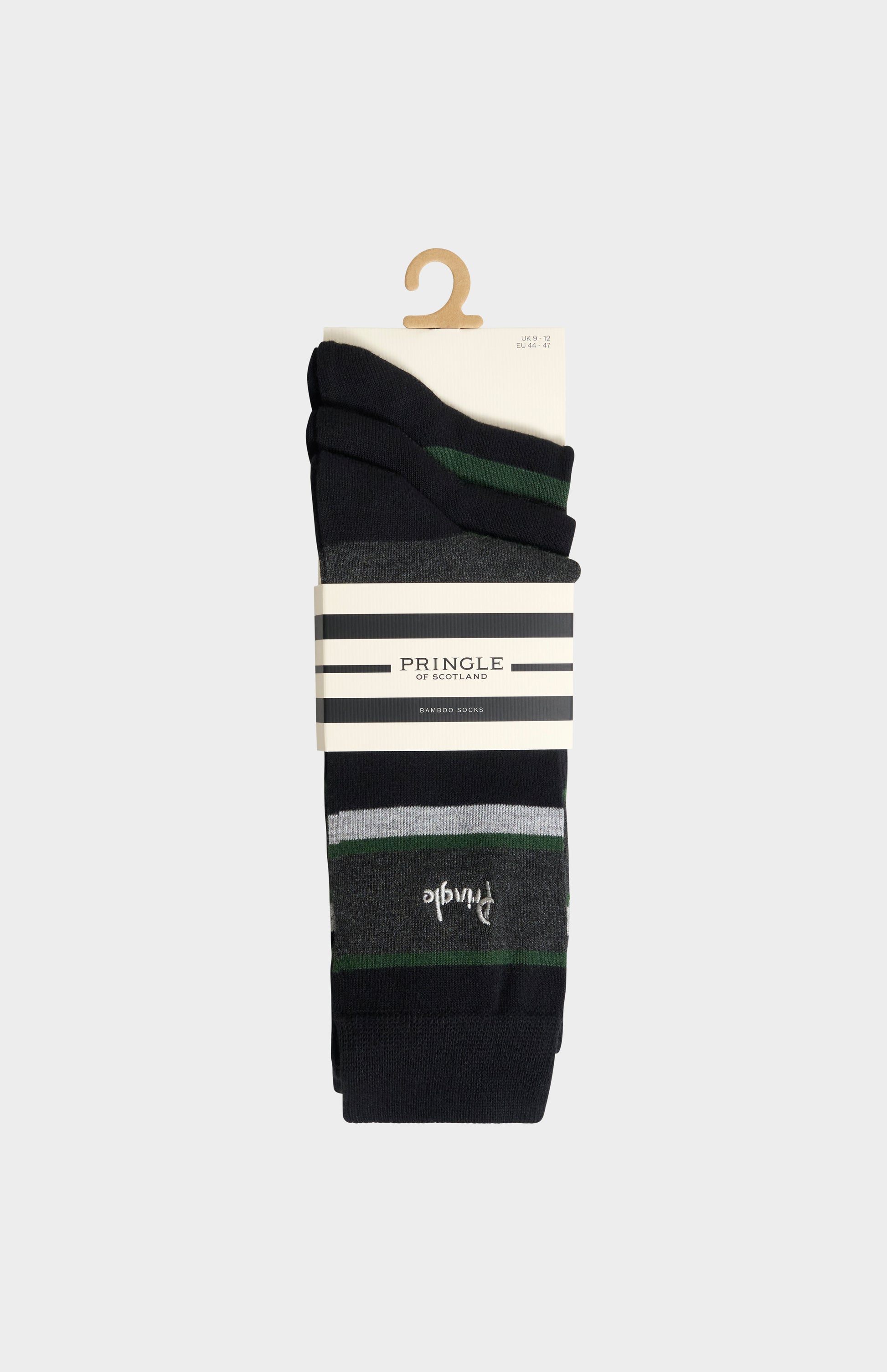 These men’s bamboo jacquard stripe socks feature a combination of charcoal and green  stripes with subtle Pringle contrast embroidery. Made from premium bamboo, they provide softness, comfort, and durability for everyday wear.