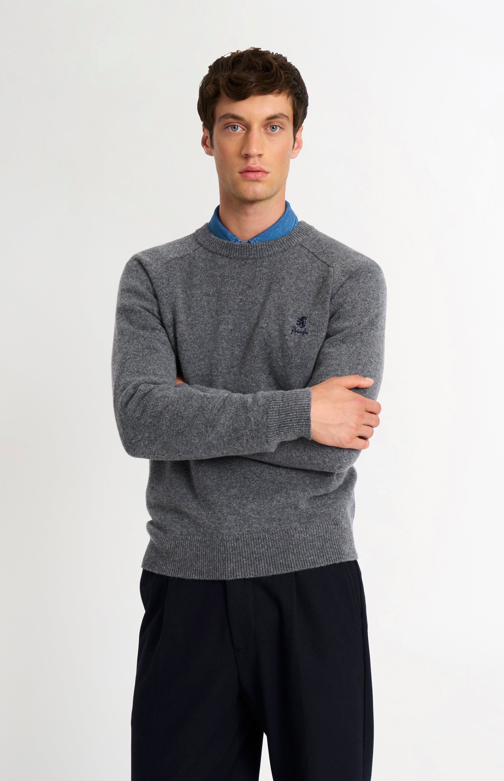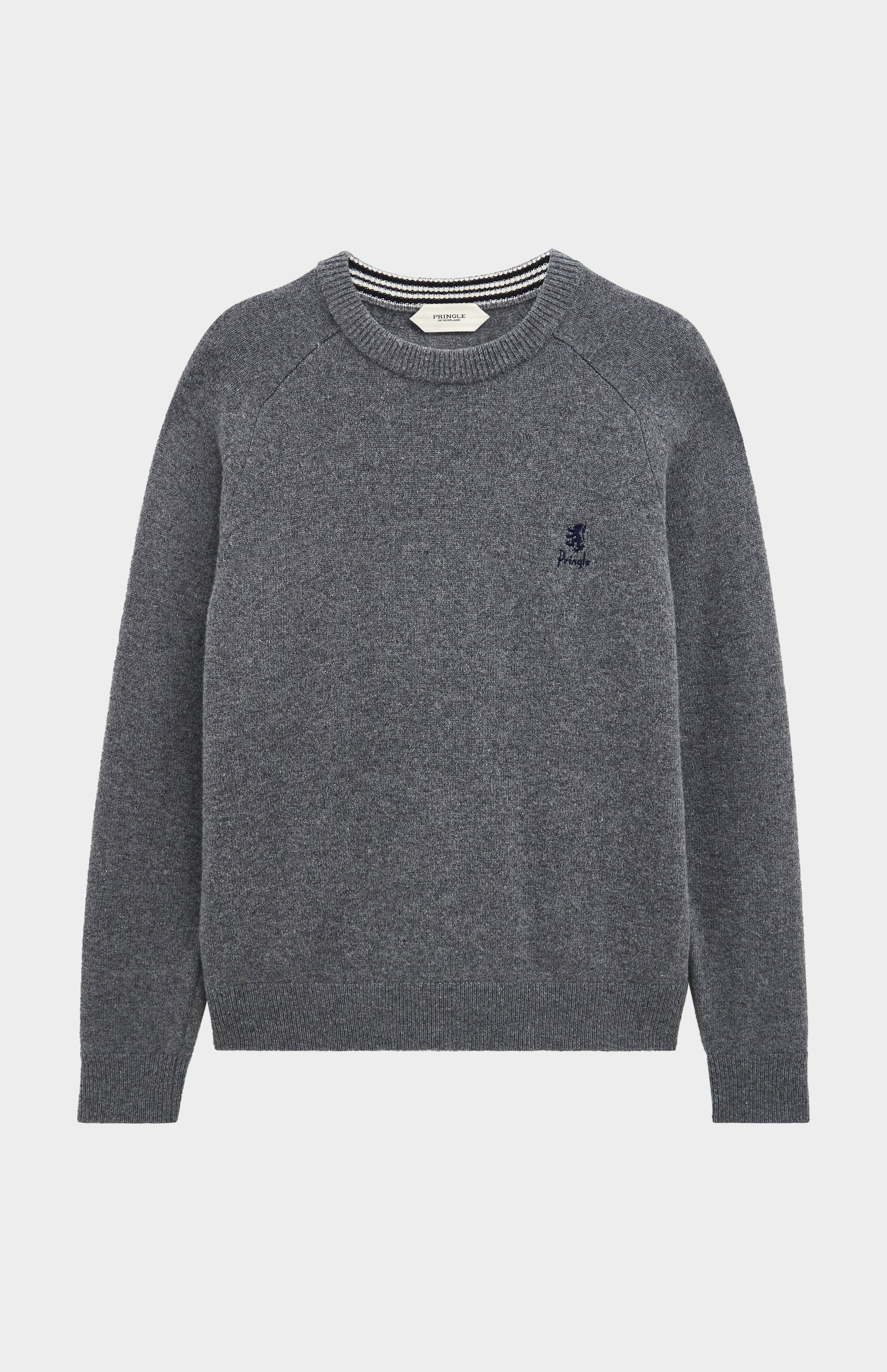 A refined everyday essential. This classic crew neck jumper in Grey Melange is crafted from 100% supersoft lambswool, featuring an ultra-soft handle thanks to its premium 17.5-micron fibres. Midweight, breathable, and exceptionally smooth to the touch, it offers all-day comfort with a luxurious finish. Designed as a timeless wardrobe staple, it combines classic style with thoughtful modern details including a house stripe rib detail along the side seams and a contrasting house stripe at the back neck. The iconic Pringle lion, paired with vintage-inspired typography, is subtly embroidered on the chest in a contrast finish. Smart enough to dress up, yet relaxed enough for everyday wear this versatile piece is crafted to endure and elevate your wardrobe for seasons to come.