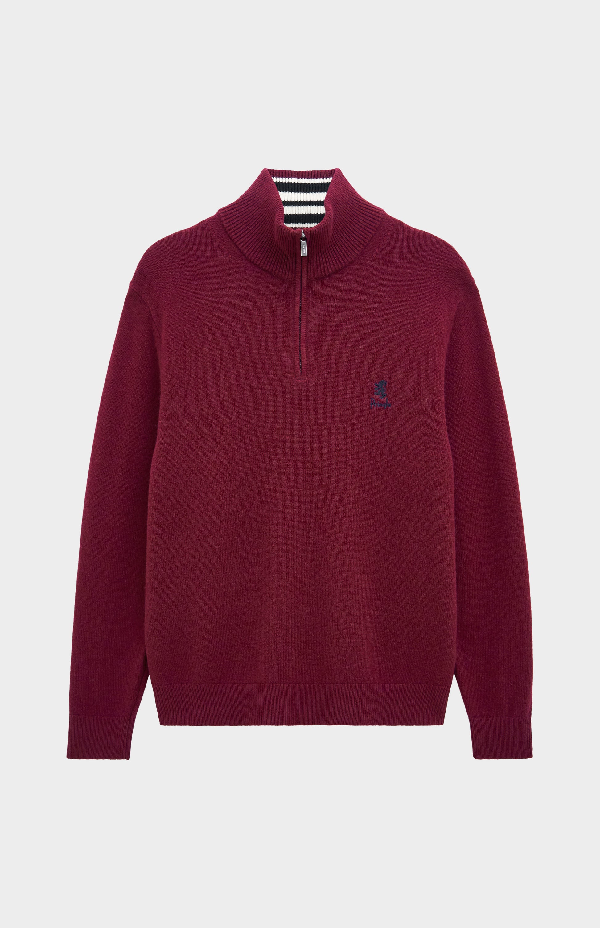 A refined everyday essential. This classic quarter zip neck jumper in Burgundy is crafted from 100% supersoft lambswool, featuring an ultra-soft handle thanks to its premium 17.5-micron fibres. Midweight, breathable, and exceptionally smooth to the touch, it offers all-day comfort with a luxurious finish. Designed as a timeless wardrobe staple, it combines classic style with thoughtful modern details including a house stripe rib detail along the side seams and a contrasting house stripe at the back neck. The iconic Pringle lion, paired with vintage-inspired typography, is subtly embroidered on the chest in a contrast finish. Smart enough to dress up, yet relaxed enough for everyday wear ? this versatile piece is crafted to endure and elevate your wardrobe for seasons to come.