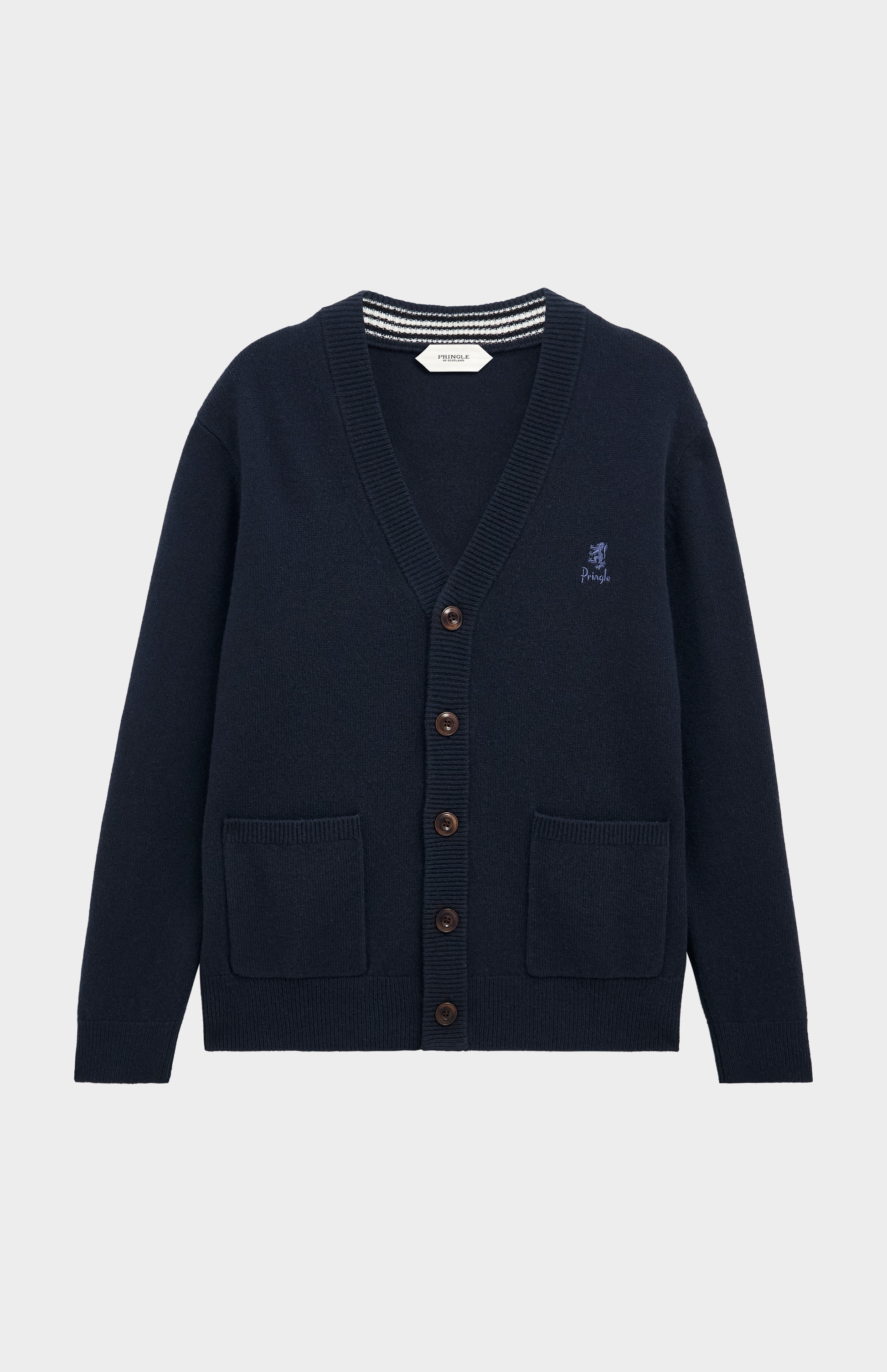 A refined everyday essential. This classic cardigan in Navy Blue is crafted from 100% supersoft lambswool, featuring an ultra-soft handle thanks to its premium 17.5-micron fibres. Midweight, breathable, and exceptionally smooth to the touch, it offers all-day comfort with a luxurious finish. Designed as a timeless wardrobe staple, it combines classic style with thoughtful modern details including a house stripe rib detail along the side seams and a contrasting house stripe at the back neck. The iconic Pringle lion, paired with vintage-inspired typography, is subtly embroidered on the chest in a contrast finish. Smart enough to dress up, yet relaxed enough for everyday wear this versatile piece is crafted to endure and elevate your wardrobe for seasons to come.