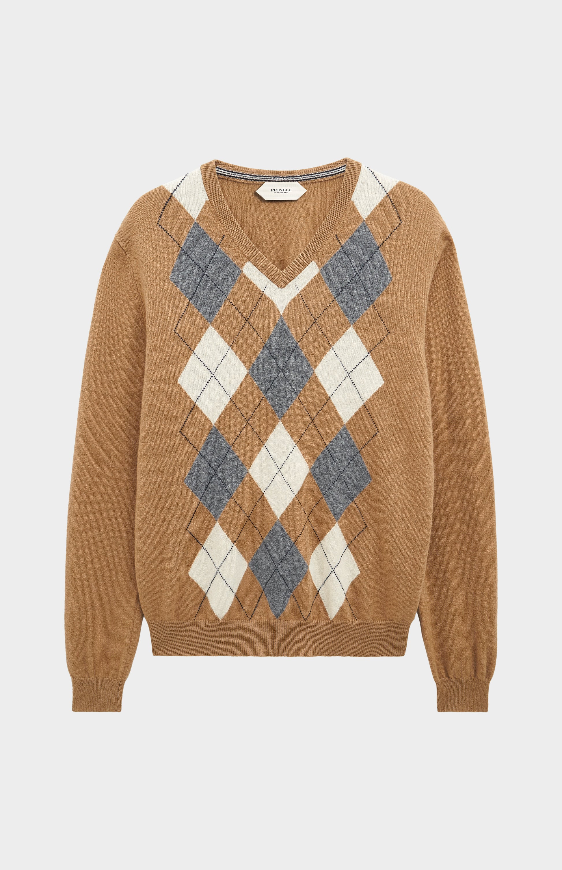 Men's Classic V-neck Cashmere Argyle Jumper In Camel / Ecru / Grey