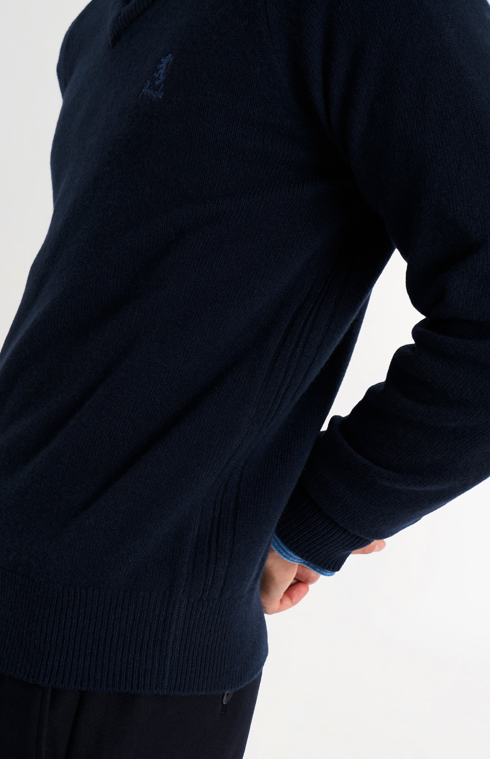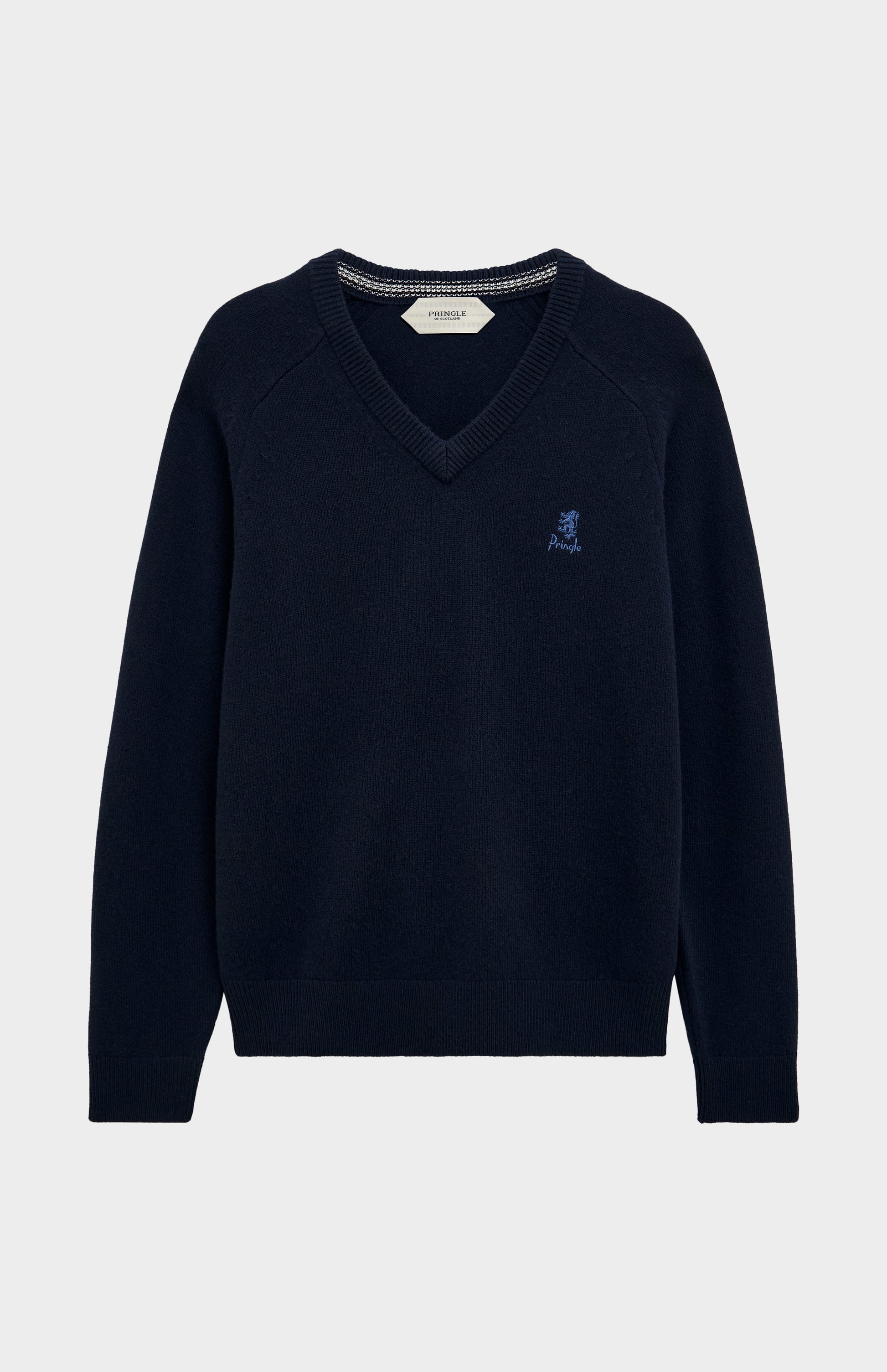 A refined everyday essential. This classic v-neck neck jumper in Navy Blue is crafted from 100% supersoft lambswool, featuring an ultra-soft handle thanks to its premium 17.5-micron fibres. Midweight, breathable, and exceptionally smooth to the touch, it offers all-day comfort with a luxurious finish. Designed as a timeless wardrobe staple, it combines classic style with thoughtful modern details including a house stripe rib detail along the side seams and a contrasting house stripe at the back neck. The iconic Pringle lion, paired with vintage-inspired typography, is subtly embroidered on the chest in a contrast finish. Smart enough to dress up, yet relaxed enough for everyday wear this versatile piece is crafted to endure and elevate your wardrobe for seasons to come.