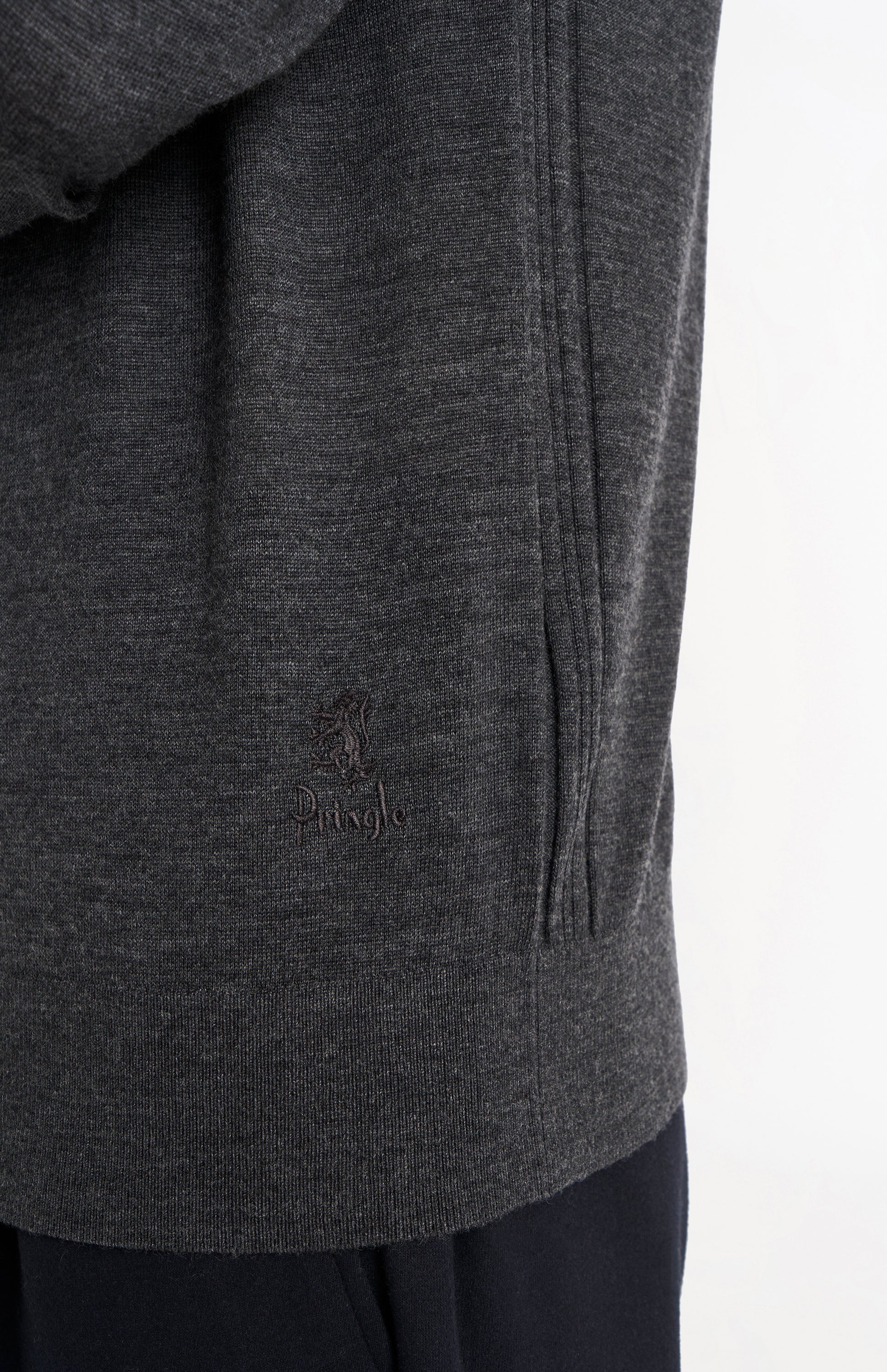 This charcoal melenge crew neck knit is made from extra-fine Biella Merino wool in a 14-gauge knit, offering a lightweight and breathable piece that's ideal for both warmer weather and effortless layering. The wool is sourced from expert spinners and is rigorously tested for consistency and durability, ensuring high standards of quality and performance. Designed with subtle detailing, it features Pringle's signature house stripe as ribbed accents along the side seams and back shoulder, along with a fine contrast-colour stripe at the back neck. The garment is finished with the iconic lion logo and vintage-inspired branding embroidered just above the hem. A dependable wardrobe staple, this piece delivers smart, versatile style for everyday wear.