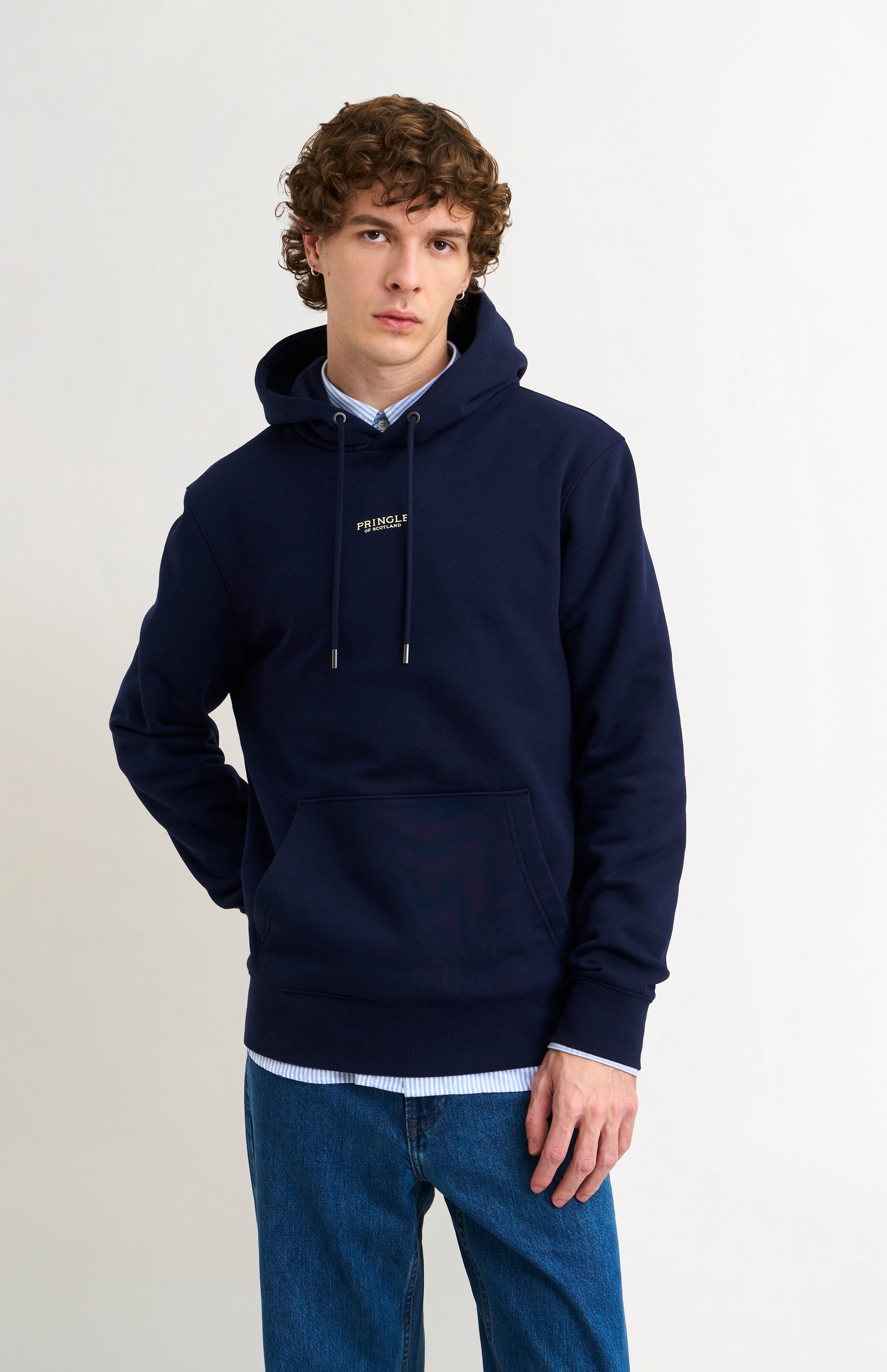 This timeless hoodie in navy blue is the epitome of elevated casualwear - clean, contemporary, and built to last. Designed for everyday comfort, it offers enduring durability without compromising its ultra-soft hand feel. The brushed interior delivers an exceptionally smooth touch against the skin, making it your go-to for refined, effortless style. Elevated details complete the design - from the signature house stripe back neck tape to the subtle, rubberised 3D logo on the chest that adds a modern, tactile finish. Brushed metal trims featuring the branded logo on the eyelets and drawcord ends ads to its premium aesthetic. A classic kangaroo pocket serves both function and relaxed appeal. This hoodie is a quiet yet confident statement of craftsmanship and quality.