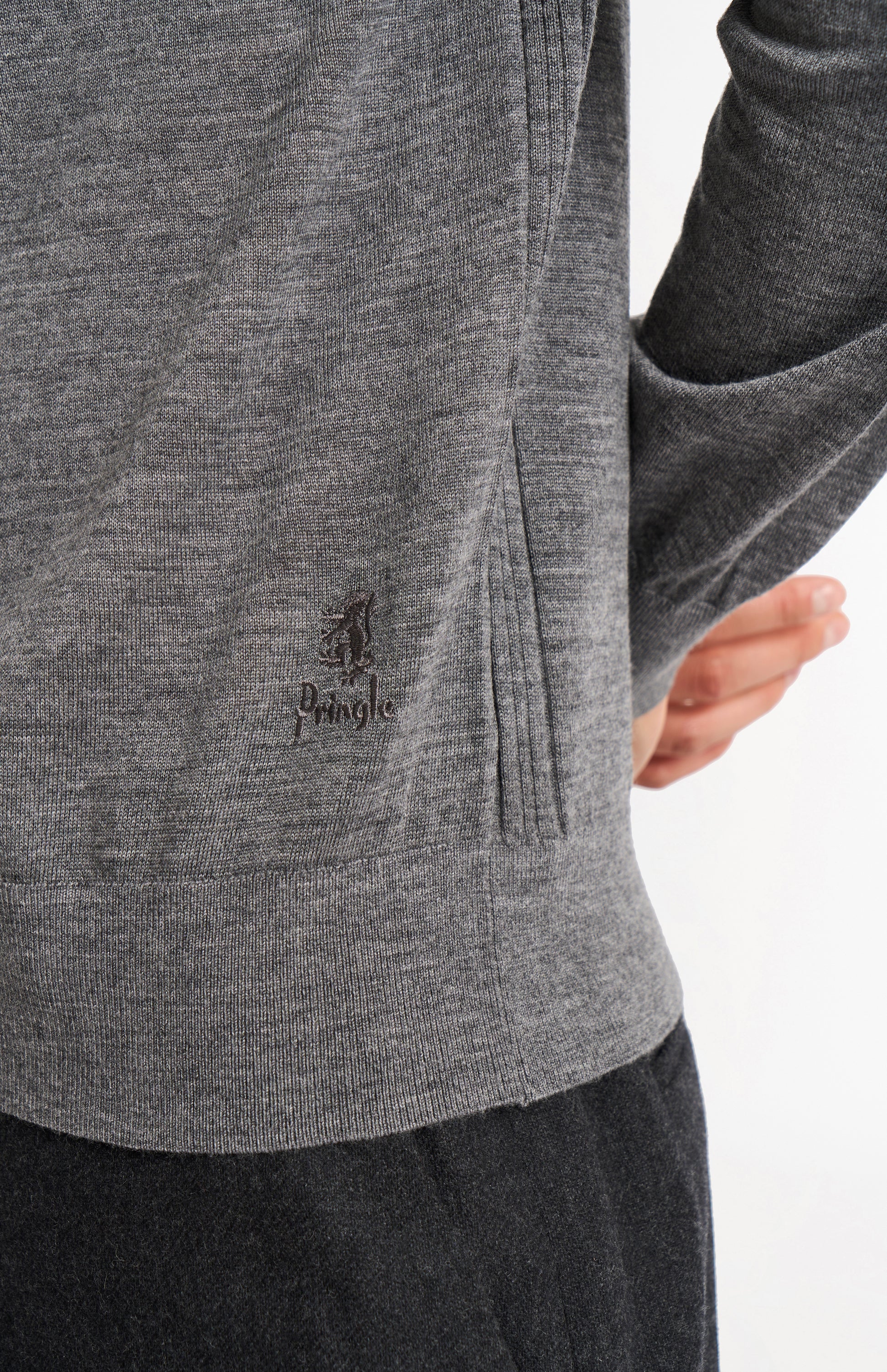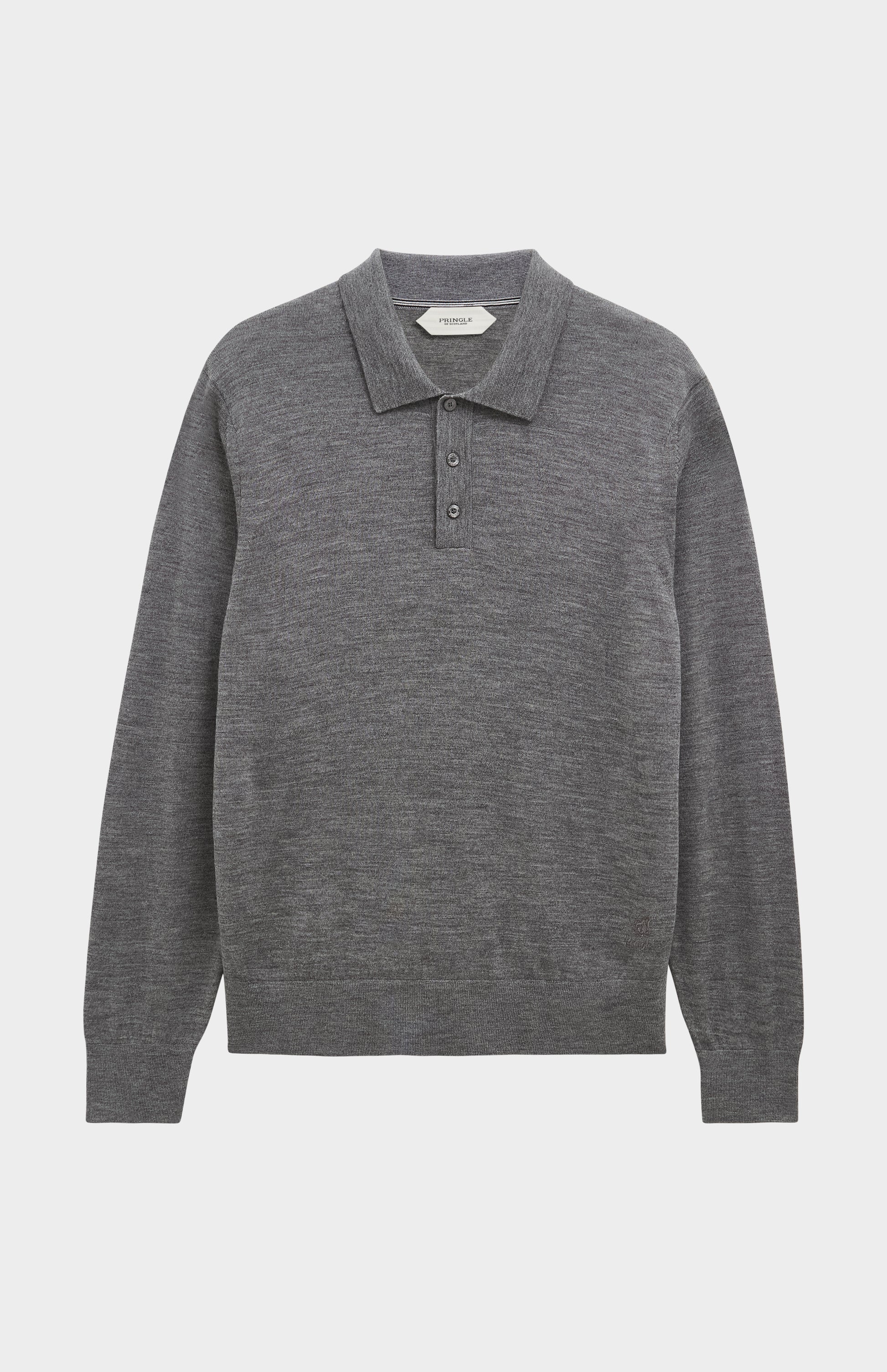 This grey melange polo shirt knit is made from extra-fine Biella Merino wool in a 14-gauge knit, offering a lightweight and breathable piece that's ideal for both warmer weather and effortless layering. The wool is sourced from expert spinners and is rigorously tested for consistency and durability, ensuring high standards of quality and performance. Designed with subtle detailing, it features Pringle's signature house stripe as ribbed accents along the side seams and back shoulder, along with a fine contrast-colour stripe at the back neck. The garment is finished with the iconic lion logo and vintage-inspired branding embroidered just above the hem. A dependable wardrobe staple, this piece delivers smart, versatile style for everyday wear.