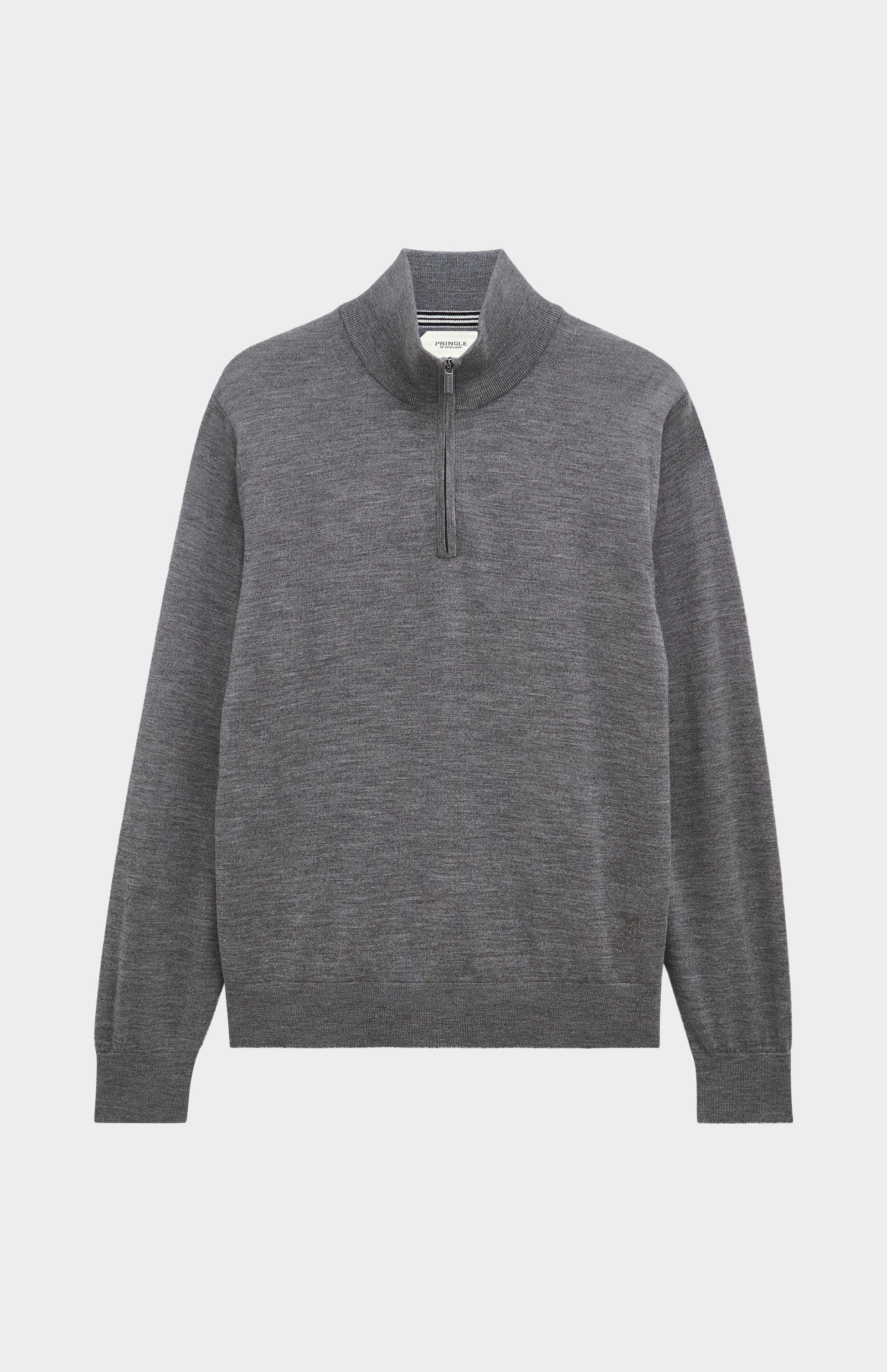 This grey melange quarter zip knit is made from extra-fine Biella Merino wool in a 14-gauge knit, offering a lightweight and breathable piece that's ideal for both warmer weather and effortless layering. The wool is sourced from expert spinners and is rigorously tested for consistency and durability, ensuring high standards of quality and performance. Designed with subtle detailing, it features Pringle's signature house stripe as ribbed accents along the side seams and back shoulder, along with a fine contrast-colour stripe at the back neck. The garment is finished with the iconic lion logo and vintage-inspired branding embroidered just above the hem. A dependable wardrobe staple, this piece delivers smart, versatile style for everyday wear.