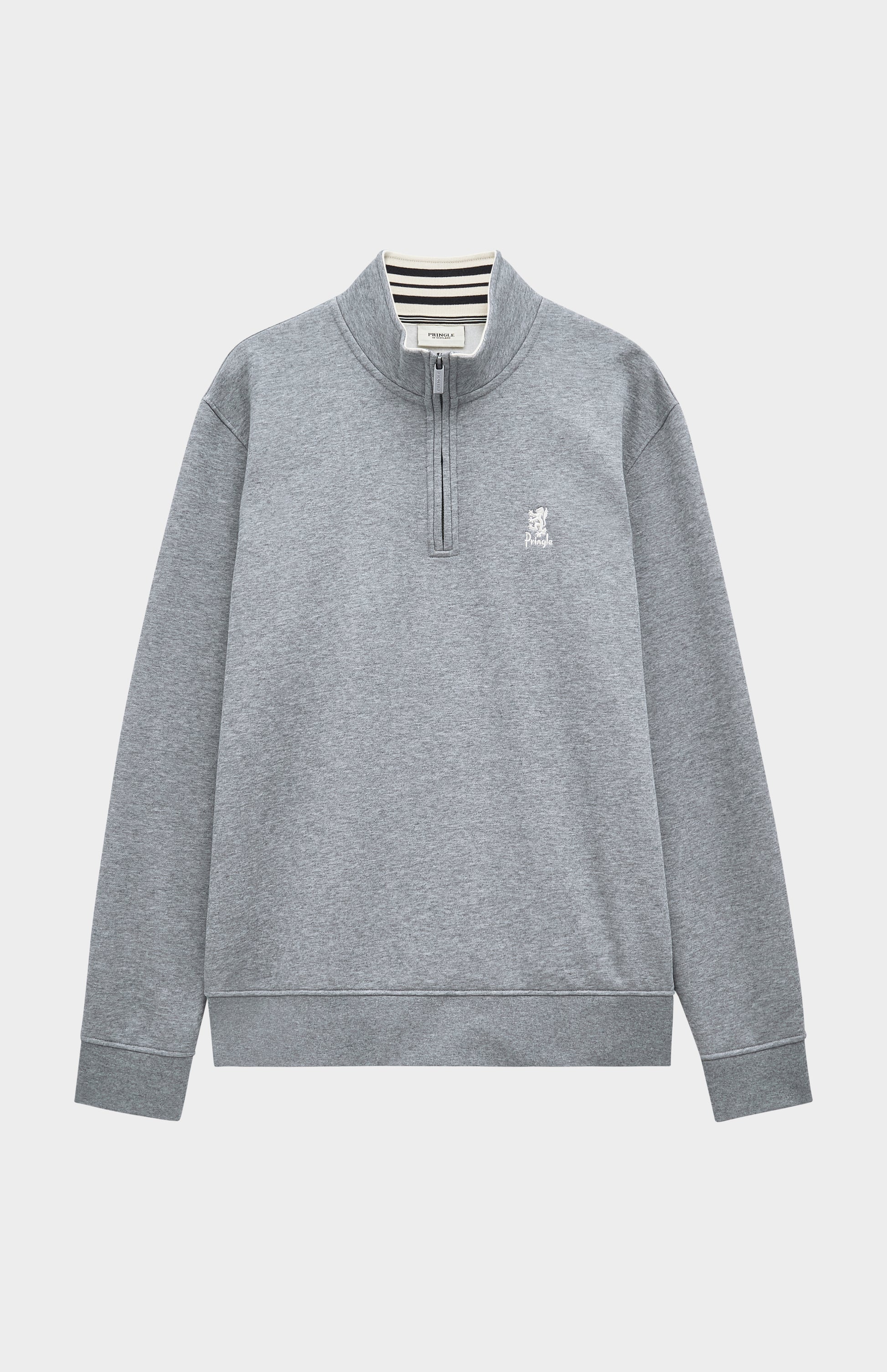This timeless quarter zip sweatshirt in grey melange defines elevated casualwear - clean, contemporary, and built to last. Designed for everyday comfort, it offers lasting durability without compromising its ultra soft hand feel. The brushed interior delivers an exceptionally smooth touch against the skin, making it your go-to for refined, effortless style. Elevated with thoughtful details, including the signature house stripe back neck tape and lion logo on the chest for a modern, tactile finish. The internal ribbed collar, featuring the house stripe and jacquard-woven logo, adds an extra layer of craftsmanship. The branded brushed metal zip serves as a sleek and functional addition, enhancing both style and practicality. This Qtr zip is a quiet yet confident statement of craftsmanship and quality.