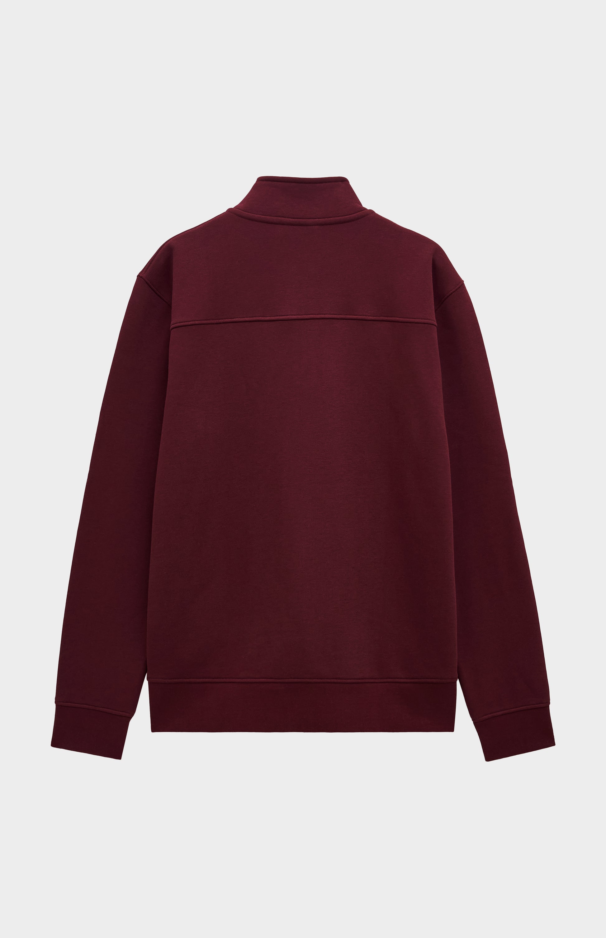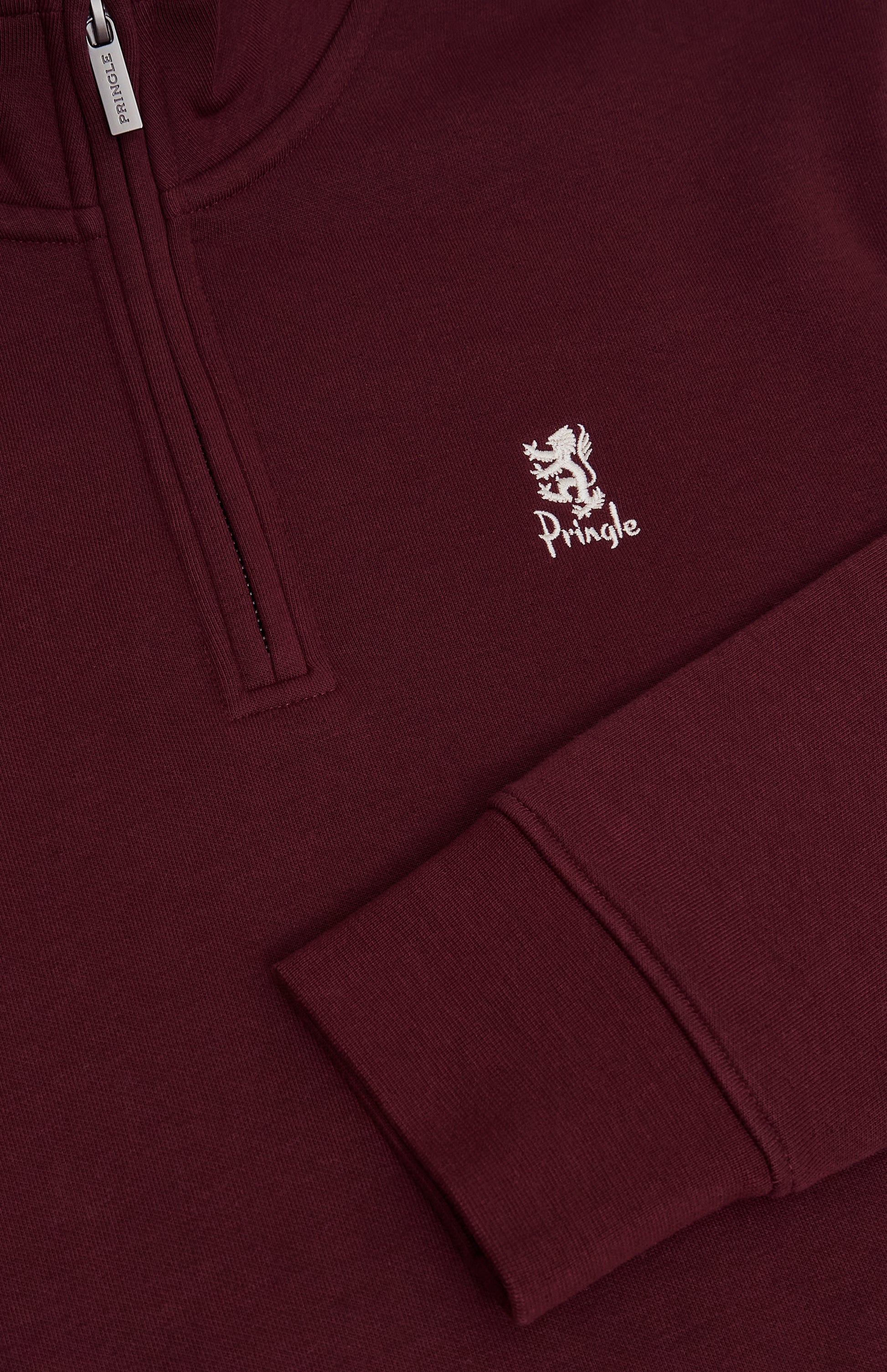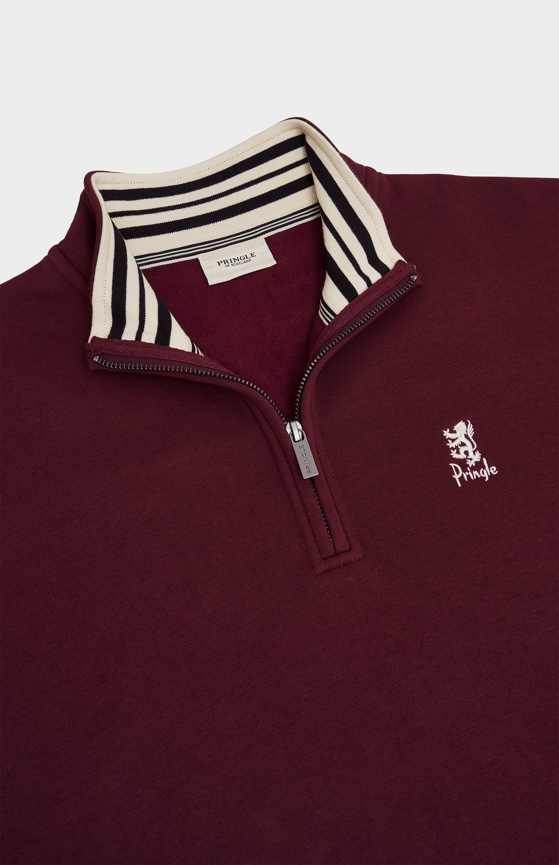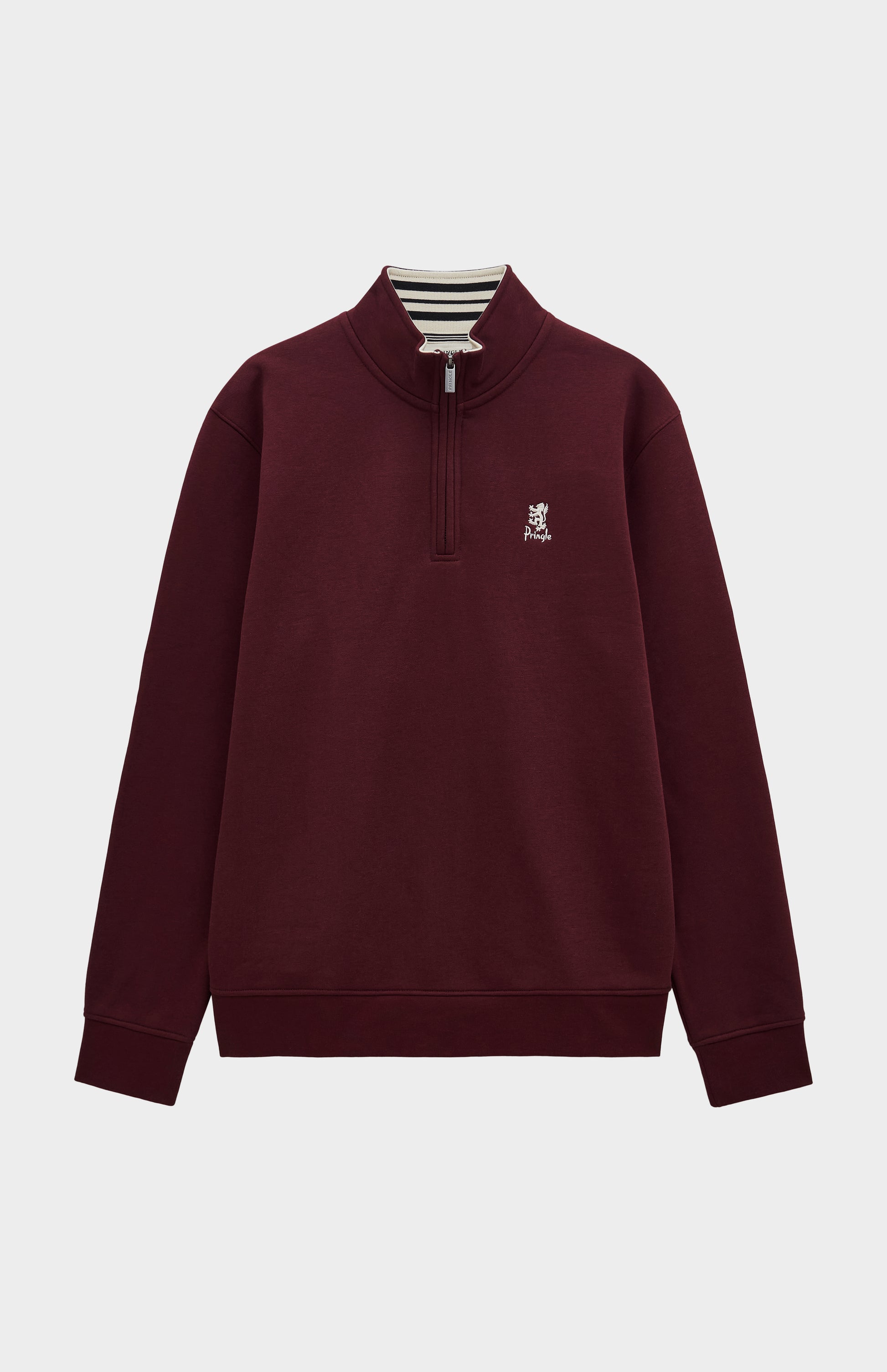 This timeless quarter zip sweatshirt in burgundy defines elevated casualwear - clean, contemporary, and built to last. Designed for everyday comfort, it offers lasting durability without compromising its ultra soft hand feel. The brushed interior delivers an exceptionally smooth touch against the skin, making it your go-to for refined, effortless style. Elevated with thoughtful details, including the signature house stripe back neck tape and lion logo on the chest for a modern, tactile finish. The internal ribbed collar, featuring the house stripe and jacquard-woven logo, adds an extra layer of craftsmanship. The branded brushed metal zip serves as a sleek and functional addition, enhancing both style and practicality. This Qtr zip is a quiet yet confident statement of craftsmanship and quality.
