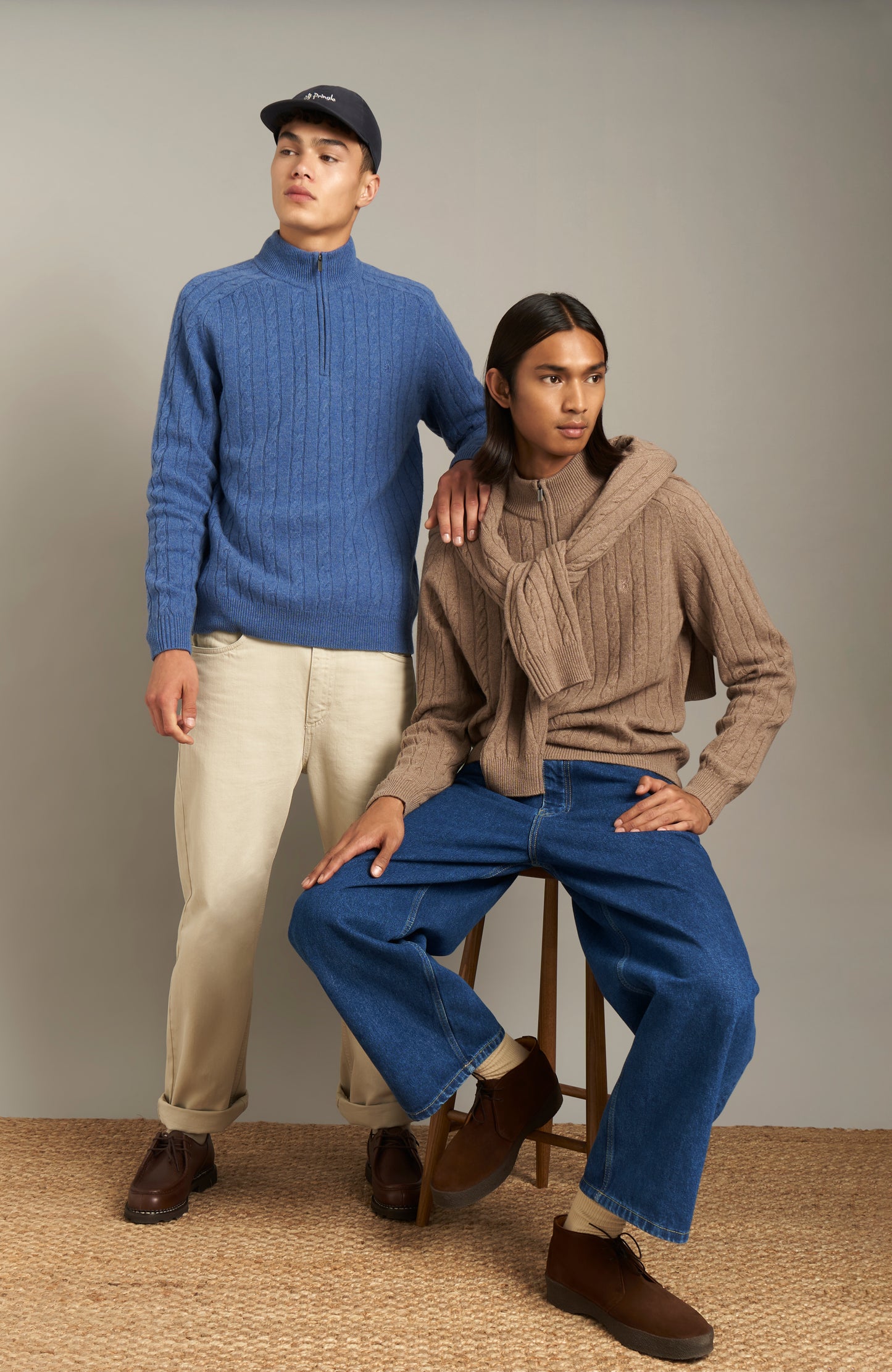 This classic men's quarter zip lambswool jumper in Dark Natural features our signature rib detail on the trims and a discreet embroidered lion emblem at the chest. Made from super soft 100% lambswool.