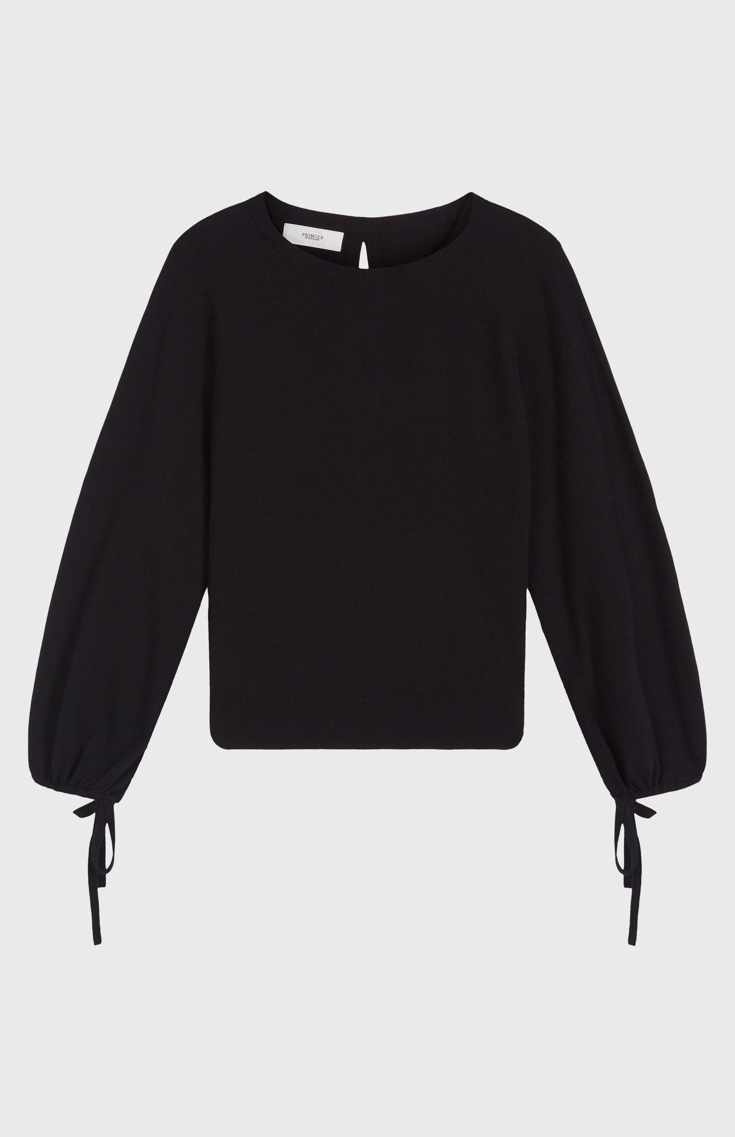 Made in Scotland, this relaxed fit round neck jumper in black features modern and elegant long sleeves with dropped shoulder detail and with tie gathering at cuff. The round neck is featured with subtle back opening for elegant and feminine look. A beautiful bold colour and lightweight making it perfect and timeless choice for this season.